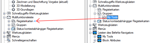 - Ziehen Sie die neue Multifunktionsleisten-Gruppe aus dem Bereich Anpassungen in <Dateiname> rechts vom Knoten Gruppen einer geladenen CUIx-Datei in den Bereich Anpassungen in <Dateiname> auf der linken Seite.