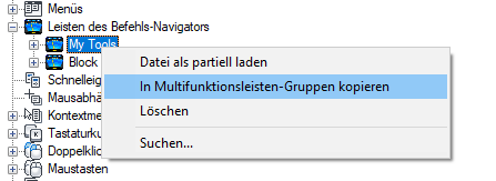 - Klicken Sie mit der rechten Maustaste auf den Befehls-Navigator, den Sie kopieren und in eine Multifunktionsleisten-Gruppe konvertieren möchten. Klicken Sie auf In Multifunktionsleisten-Gruppen kopieren.