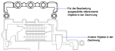 Objekte, die Sie aus der ausgewählten XRef-Datei oder dem Block auswählen, werden temporär extrahiert und in der aktuellen Zeichnung zum Bearbeiten bereitgestellt. Der Satz der extrahierten Objekte, der Bearbeitungssatz, kann bearbeitet und anschließend in der XRef-Datei oder der Blockdefinition gespeichert werden.