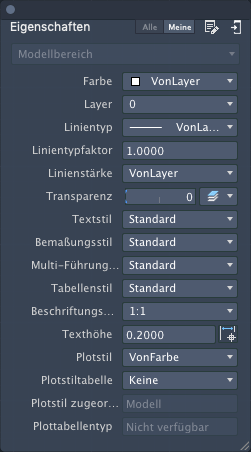 Zeigt die Eigenschaften für die aktuelle Zeichnung oder ausgewählte Objekte an.