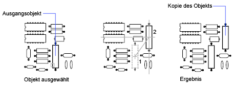 Sie können ein Objekt kopieren, indem Sie einen Basispunkt und einen zweiten Punkt festlegen, die Entfernung und Richtung vorgeben. In diesem Beispiel kopieren Sie den Block, der für eine elektronische Komponente steht. Wählen Sie das zu kopierende Originalobjekt aus. Legen Sie einen Basispunkt (1) und einen zweiten Punkt (2) fest. Das Objekt wird in die Richtung und um die Entfernung, die Punkt 1 vorgibt, an Punkt 2 kopiert.