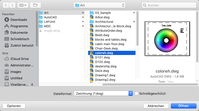 Je nach der Art des Dialogfelds zur Dateiauswahl wird die ausgewählte Datei geöffnet oder gespeichert bzw. der Pfad des ausgewählten Ordners im vorherigen Dialogfeld eingegeben.