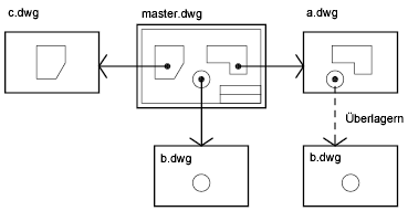 In der folgenden Abbildung bearbeiten verschiedene Personen Zeichnungen, die von master.dwg referenziert werden. Die Person, die a.dwg bearbeitet, muss die Änderungen der Person anzeigen, die b.dwg bearbeitet. Es soll jedoch keine XRef für b.dwg verwendet werden, da die Zeichnung in diesem Fall zweimal in master.dwg angezeigt würde. Stattdessen überlagert die Person b.dwg, sodass diese Zeichnung nicht integriert wird, wenn a.dwg von master.dwg referenziert wird.