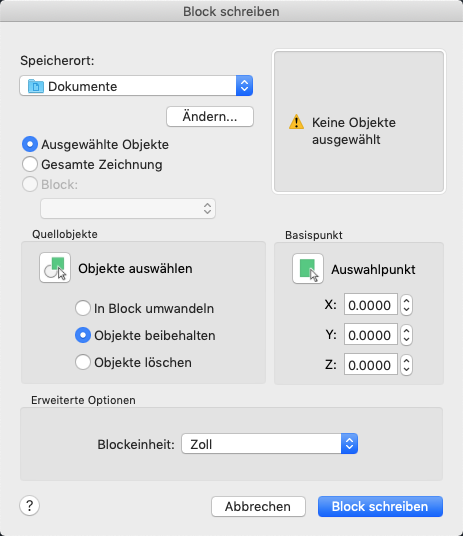 Im Dialogfeld Block schreiben werden unterschiedliche Vorgabeeinstellungen angezeigt, je nachdem, ob nichts, ein einzelner Block oder andere Objekte ausgewählt sind.