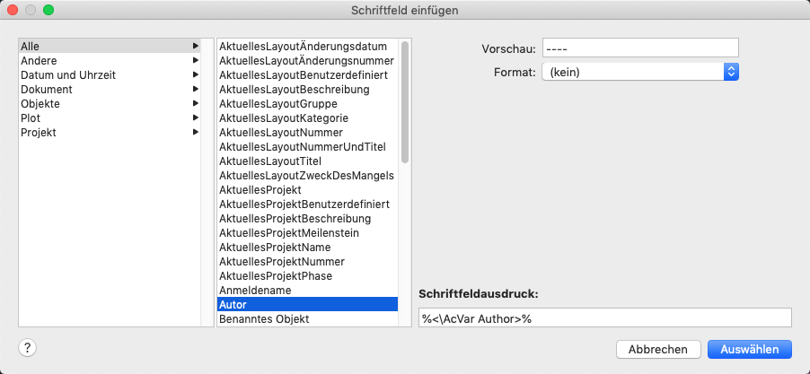 Zeigt den Ausdruck an, der dem Schriftfeld zugrunde liegt. Der Schriftfeldausdruck kann zwar nicht bearbeitet werden, dieser Bereich gibt jedoch Aufschluss darüber, wie Schriftfelder aufgebaut sind.