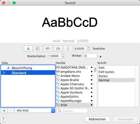Wenn Sie einen Namen aus der Liste auswählen, wird die Datei für diese Schrift eingelesen. Die Zeichendefinitionen der Datei werden automatisch geladen, wenn die Datei nicht bereits von einem anderen Textstil verwendet wird. Es können mehrere Stile für dieselbe Schrift definiert werden.