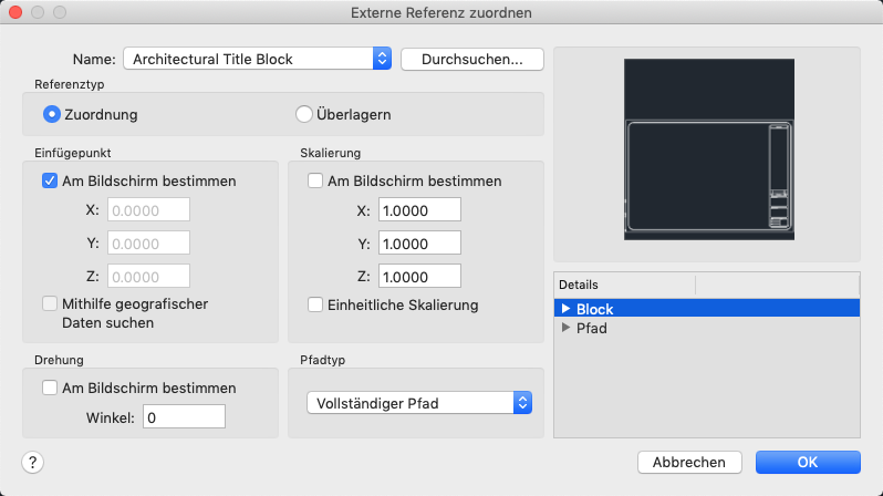 Zeigt Informationen über den Block un den Dateipfad der zugeordneten externen Referenzen an.