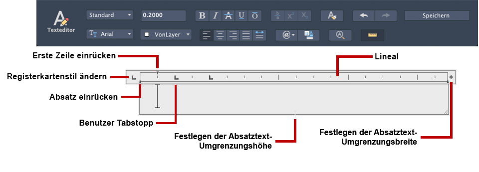 Legt die Ausrichtung des MText-Objekts fest. Sie können auswählen, ob Sie den Text links, mittig oder rechts ausrichten. Sie können den Text oder die ersten und letzten Zeichen des Texts mit den Rändern des Mtext-Felds ausrichten. Weiterhin können Sie jede Zeile des Texts mittig innerhalb der Ränder des Mtext-Felds ausrichten. Leerzeichen am Ende einer Zeile werden in den Text aufgenommen und wirken sich auf die Ausrichtung der Zeile aus. (Nicht für einzeiligen Text verfügbar.)