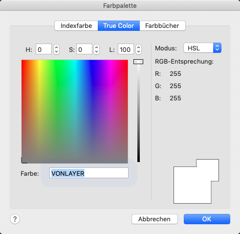 Gibt die Farbeinstellungen mit True Color (24-Bit)-Farben im HSL (Farbton, Sättigung, Helligkeit)- oder RGB (Rot, Grün, Blau)-Farbmodell an. Bei Verwendung der True Color-Funktion stehen über sechzehn Millionen Farben zur Auswahl. Die Optionen auf der Registerkarte True Color sind je nach Auswahl des Farbmodells unterschiedlich.
