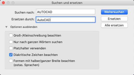 Ermittelt alle Textstellen, an denen der Text im Feld Suchen nach gefunden wird, und ersetzt diese Fundstellen durch den Text im Feld Ersetzen durch.