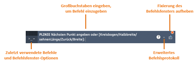 Nachdem Sie einen Befehl eingegeben haben, wird in der Befehlszeile ggf. eine Reihe von Eingabeaufforderungen angezeigt. Nachdem Sie z. B. PLINIE eingeben und dann die erste Eingabeaufforderung festlegen, wird die folgende Eingabeaufforderung angezeigt: