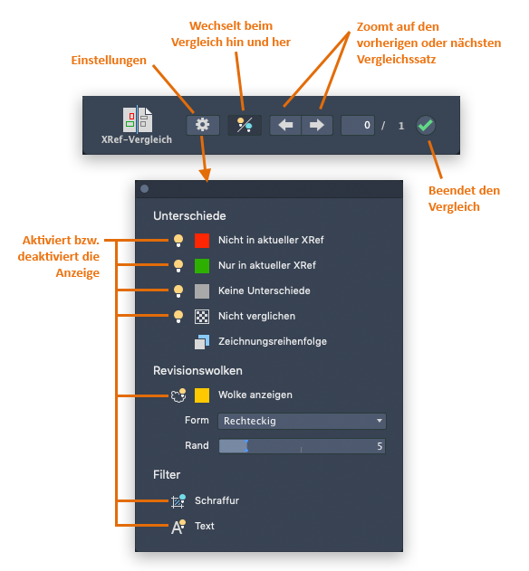 Die Leiste XRef-Vergleich wird geöffnet, und die Vergleichsergebnisse werden in der aktuellen Zeichnung angezeigt. Diese Leiste enthält eine Reihe von Befehlen und Einstellungen für die Überprüfung und Steuerung des Vergleichsergebnisses.