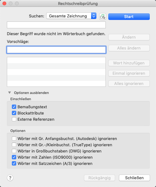 Prüft die Rechtschreibung für einzeiligen und mehrzeiligen Text, Multiführungslinien-Text, Text in Blockattributen, Text in Xrefs und zu Bemaßungen hinzugefügten Text.