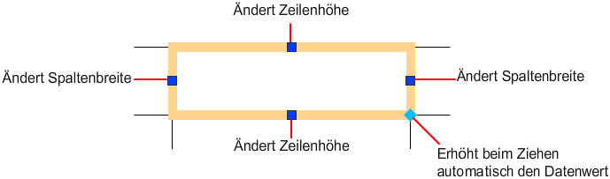 Klicken Sie in eine Zelle, um diese auszuwählen. In der Mitte der Zellengrenzen werden daraufhin Griffe angezeigt. Klicken Sie in eine andere Zelle, um die Auswahl zu dieser Zelle zu verschieben. Ziehen Sie die Griffe, um die Zelle und die zugehörige Spalte oder Zeile zu vergrößern oder zu verkleinern.
