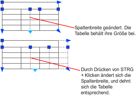 Wenn Sie die Höhe oder Breite der Tabelle ändern, ändert sich nur die Zeile oder Spalte neben dem Griff, den Sie ausgewählt haben. Die Tabelle selbst behält ihre Höhe bzw. Breite. Um die Größe einer Tabelle proportional zu der Größe der Zeile oder Spalte, die Sie bearbeiten, zu ändern, drücken Sie die STRG-Taste, während Sie einen Spaltengriff verwenden.
