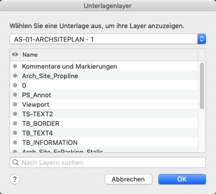 Zeigt die Namen aller verfügbaren Layer in der ausgewählten Unterlage an