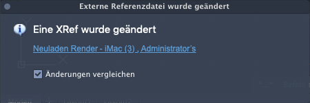Wenn eine oder mehrere XRef-Dateien nicht gefunden werden oder eine der XRef-Dateien neu geladen werden muss, wird eine Sprechblasen-Benachrichtigung in der Nähe der unteren linken Ecke des Zeichenbereichs angezeigt. Klicken Sie auf den Link in der Positionsnummern-Meldung, um die XRef neu zu laden. Wenn Änderungen vergleichen aktiviert ist, wird die XRef-Datei mit der Referenzzeichnung verglichen, und die Vergleichsergebnisse werden in der aktuellen Zeichnung angezeigt. Wenn Sie den Vergleich schließen, wird die XRef-Datei neu geladen.