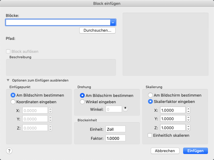 Erweitert oder reduziert den Abschnitt Optionen zum Einfügen, in dem Sie den Einfügepunkt, die Drehung und die Skalierung für die zu erstellende Blockreferenz angeben können.