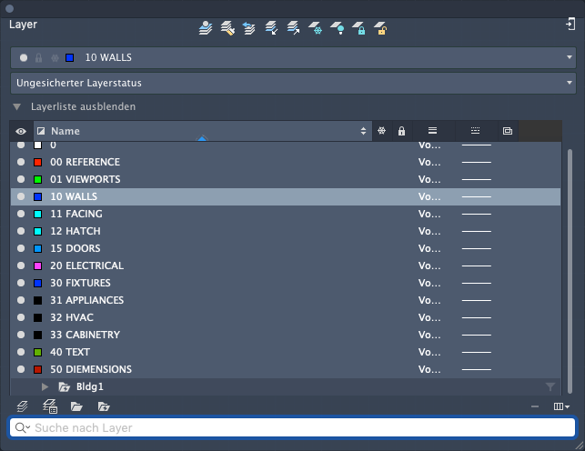 Bei komplexen Zeichnungen ist es zu empfehlen, einen detaillierteren Benennungsstandard zu verwenden. Beispielsweise könnten Layernamen mit drei Ziffern beginnen, gefolgt von einem Bezeichnungscode, der mehrere Geschosse in einem Gebäude, Projektnummern, Vermessungssätze, Eigenschaftsdaten usw. umfasst. Diese Benennungskonvention erleichtert auch das Steuern der Reihenfolge der Layer und das Beschränken der Layeranzeige in der Layerliste.