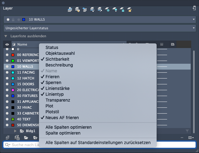 Führt die Namen aller Spalten auf. Ein Häkchen gibt an, dass die Spalte angezeigt wird. Klicken Sie zum Anzeigen oder Ausblenden der Spalte auf einen Spaltennamen. AF Frieren, AF Farbe, AF Linientyp, AF Linienstärke und AF Plotstil sind nur verfügbar, wenn ein Layout-Ansichtsfenster aktiv ist.