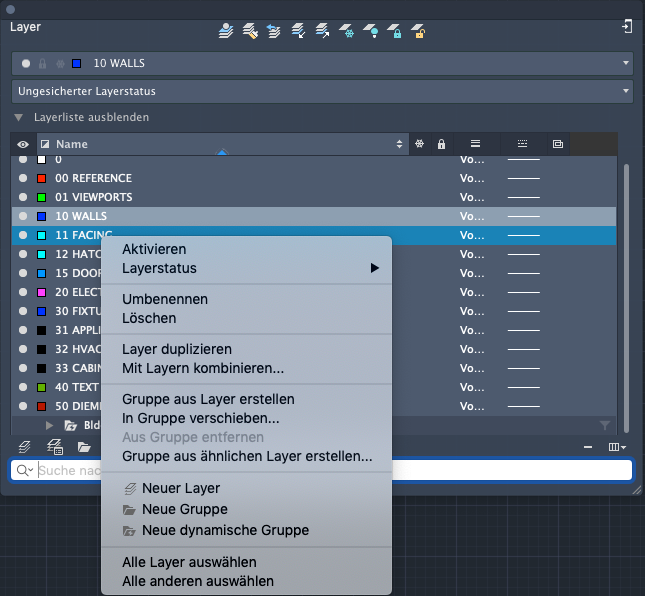 Zeigt den aktuellen Layerstatus in der Zeichnung an.