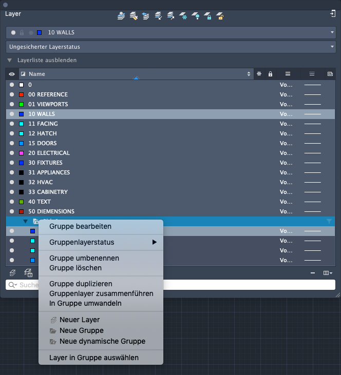 Zeigt eine Liste der Layer in der Zeichnung sowie ihre Eigenschaften an. Sie können Layer hinzufügen, löschen, umbenennen, ihre Eigenschaften ändern und die Änderungen in Echtzeit anwenden.