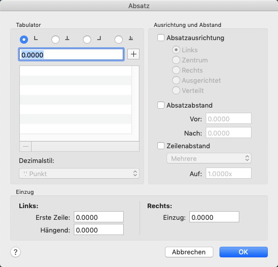 Legt Tab-Stopps und Einrückungen fest, steuert die Absatzausrichtung, den Absatzabstand und den Zeilenabstand im Absatz.