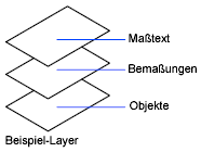 Verwenden Sie Layer, um die Sichtbarkeit der Objekte zu steuern und um Eigenschaften wie Farbe und Linientyp zuzuweisen. Objekte, die sich auf einem Layer befinden, übernehmen normalerweise die Eigenschaften dieses Layers. Sie können jedoch jede beliebige Layereigenschaft eines Objekts überschreiben. Wenn beispielsweise die Farbeigenschaft eines Objekts auf VONLAYER festgelegt ist, wird das Objekt in der Farbe dieses Layers angezeigt. Wenn für die Objektfarbe rot festgelegt ist, wird das Objekt in Rot angezeigt, unabhängig von der dem Layer zugewiesenen Farbe.
