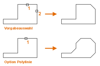 Wenn die Option Stutzen aktiviert ist und zwei Liniensegmente einer Polylinie ausgewählt sind, wird die hinzugefügte Fase oder Abschrägung mit der Polylinie als neues Liniensegment verbunden.