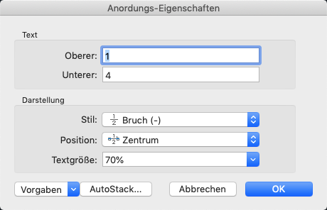 Bestimmt Stil, Position und Textgröße eines gestapelten Bruchs.