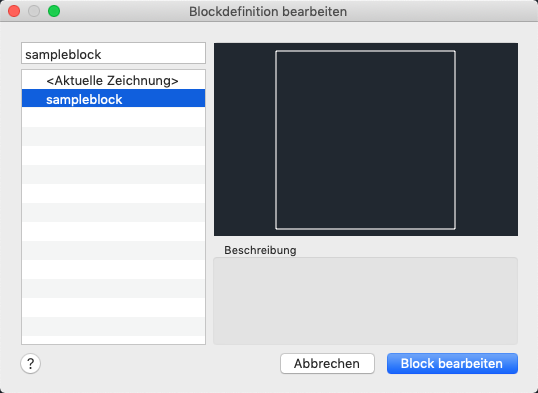 Wenn Sie auf Block bearbeiten klicken, wird diese Blockdefinition im Blockeditor geöffnet. Wenn Sie <Aktuelle Zeichnung> auswählen, wird die aktuelle Zeichnung im Blockeditor geöffnet.