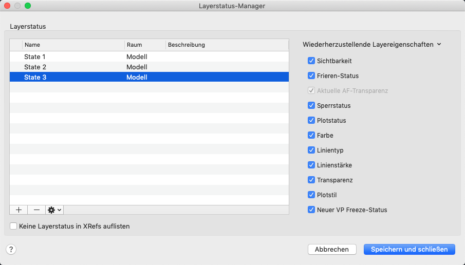 Zeigt eine Liste der in der Zeichnung gespeicherten Layerstatus an. Sie können Layerstatus erstellen, umbenennen, bearbeiten und löschen.