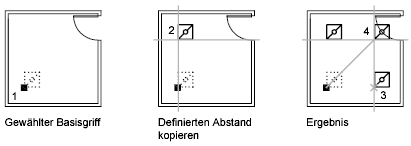 Sie können zum Beispiel ausgewählten Objekte drehen und dabei Kopien dieser Objekte an allen Punkten platzieren, die Sie mit dem Zeigegerät auswählen.