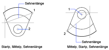 Sie können einen Bogen aus einem Startpunkt, einem Mittelpunkt und einer Sehnenlänge erstellen.