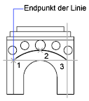 Sie können einen Bogen durch Festlegen von drei Punkten zeichnen. Im folgenden Beispiel wird der Startpunkt des Bogens am Endpunkt einer Linie gefangen. Der zweite Punkt des Bogens wird am mittleren Kreis in der Abbildung gefangen.