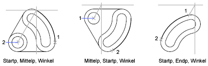 Der eingeschlossene Winkel bestimmt den Endpunkt des Bogens. Wählen Sie den Befehl Startp, Endp, Winkel, wenn Sie beide Endpunkte, aber keinen Zentrumspunkt haben, den Sie fangen können.