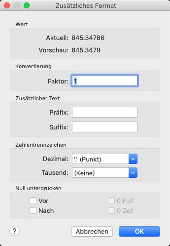 Legt den Konvertierungsfaktor fest, der für den aktuellen Wert verwendet werden soll. Der Vorgabewert ist 1 für keine Konvertierung.