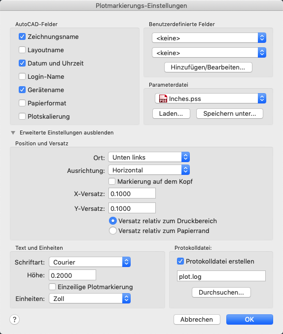 Schreibt die Plotstempelinformationen in eine Protokolldatei. Der Vorgabename der Protokolldatei ist plot.log. Sie befindet sich im Hauptanwendungsordner.