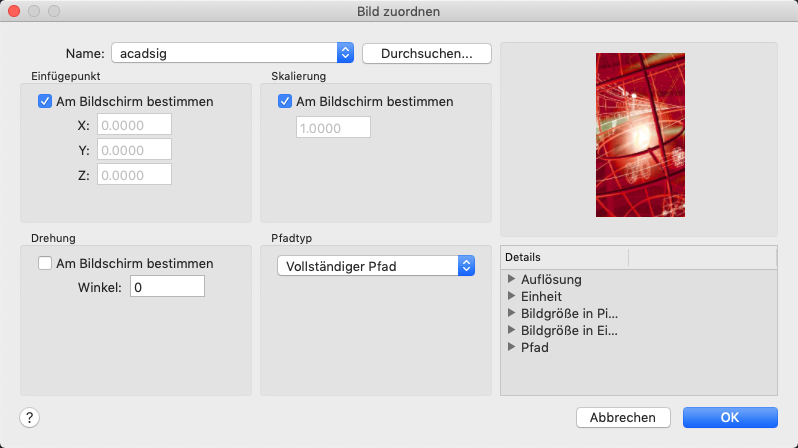 Wählen Sie den vollen (absoluten) Pfad, den relativen Pfad oder Kein Pfad sowie den Namen der Bilddatei aus (die Bilddatei muss sich in demselben Ordner wie die aktuelle Zeichnungsdatei befinden).