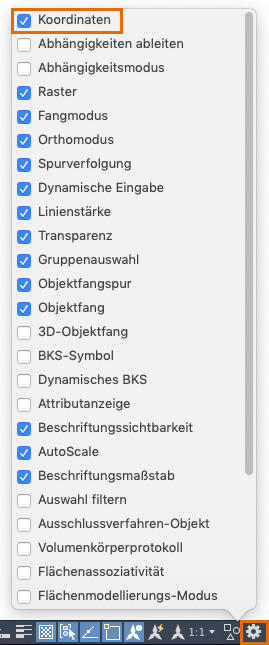 Wenn in der Statusleiste keine Koordinaten angezeigt werden, wählen Sie in den Statusleisteneinstellungen die Option Koordinaten aus.