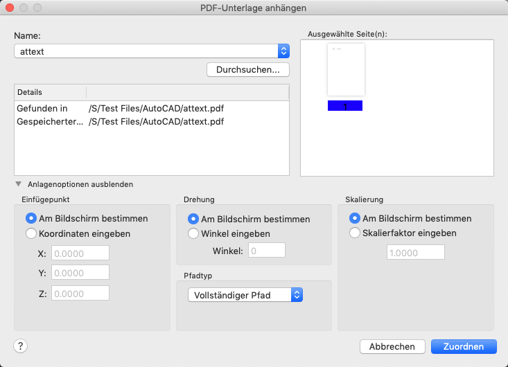 Wählen Sie den vollständigen (absoluten) Pfad, den relativen Pfad der PDF-Datei oder Kein Pfad und den Namen der PDF-Datei. Bei der Option Kein Pfad muss sich die PDF-Datei im selben Ordner wie die aktuelle Zeichnungsdatei befinden.