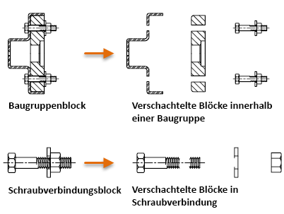 Blockreferenzen, die in einer Blockdefinition enthalten sind, werden verschachtelte Blöcke genannt. Durch das Verschachteln von Blöcken können Sie die Organisation einer komplexen Blockdefinition vereinfachen.