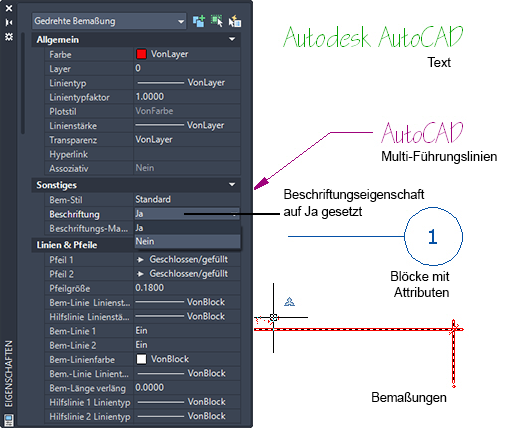 Beschriftungsobjekte umfassen Bemaßungen, Anmerkungen und andere Arten von beschreibenden Symbolen oder Objekten, die häufig dazu dienen, Zeichnungen Informationen hinzuzufügen.