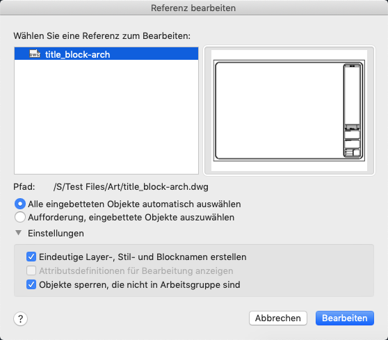 Die Voransicht entspricht der Referenz nach dem letzten Speichern in der Zeichnung. Die Voransicht der Referenz wird nicht aktualisiert, wenn Sie Änderungen an der Referenz zurückspeichern.