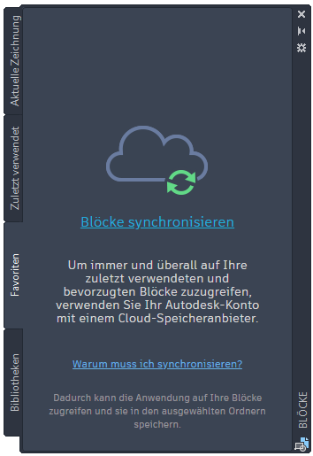 Wenn Sie nach diesem Update Ihre Blöcke über Ihr Konto bei Autodesk Account mit einem Cloud-Speicheranbieter synchronisieren, sind Ihre zuletzt verwendeten und bevorzugten Blöcke von mehreren Geräten aus zugänglich.