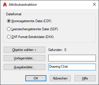Legt das Dateiformat für die Attributinformationen fest, bestimmt die Objekte, aus denen die Informationen extrahiert werden sollen, und gibt den Namen der Schablone und der Ausgabedatei für die Daten an.
