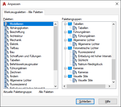 Zeigt den Namen der im Fenster Werkzeugpaletten als aktuell festgelegten Werkzeugpalettengruppe an.
