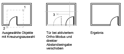 Ein praktisches Beispiel ist das Verschieben einer Tür in einer Wand. Die in der Abbildung gezeigte Tür liegt vollständig innerhalb einer kreuzenden Auswahl. Die Wandlinien liegen jedoch nur teilweise innerhalb des kreuzenden Auswahlbereichs.
