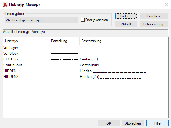 Zeigt die geladenen Linientypen in Abhängigkeit von der unter Linientypfilter gewählten Option an. Um schnell alle Linientypen auszuwählen oder zu löschen, klicken Sie mit der rechten Maustaste auf die Linientypliste, um das Kontextmenü anzuzeigen.