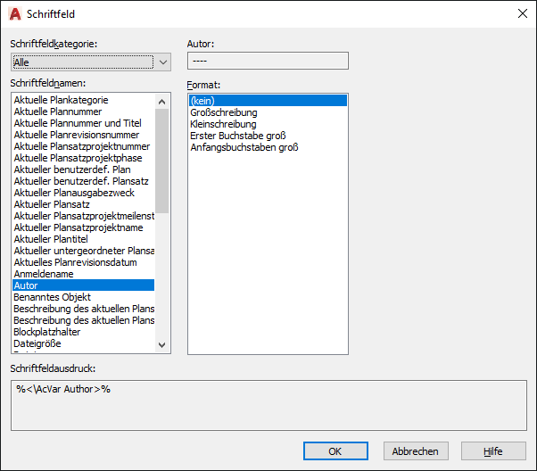 Zeigt den Ausdruck an, der dem Schriftfeld zugrunde liegt. Der Schriftfeldausdruck kann zwar nicht bearbeitet werden, dieser Bereich gibt jedoch Aufschluss darüber, wie Schriftfelder aufgebaut sind.